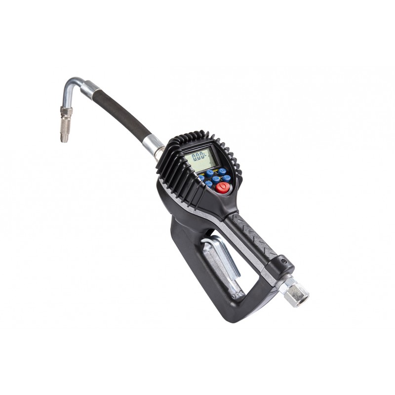 Pistola contador digital con erogación con PRESELECCIÓN o manual . El usuario la puede programar en las varias unidades de medida (litros, galónes, pintas). Está suministrada calibrada en litros, pero puede ser fácilmente calibrada por el operador.